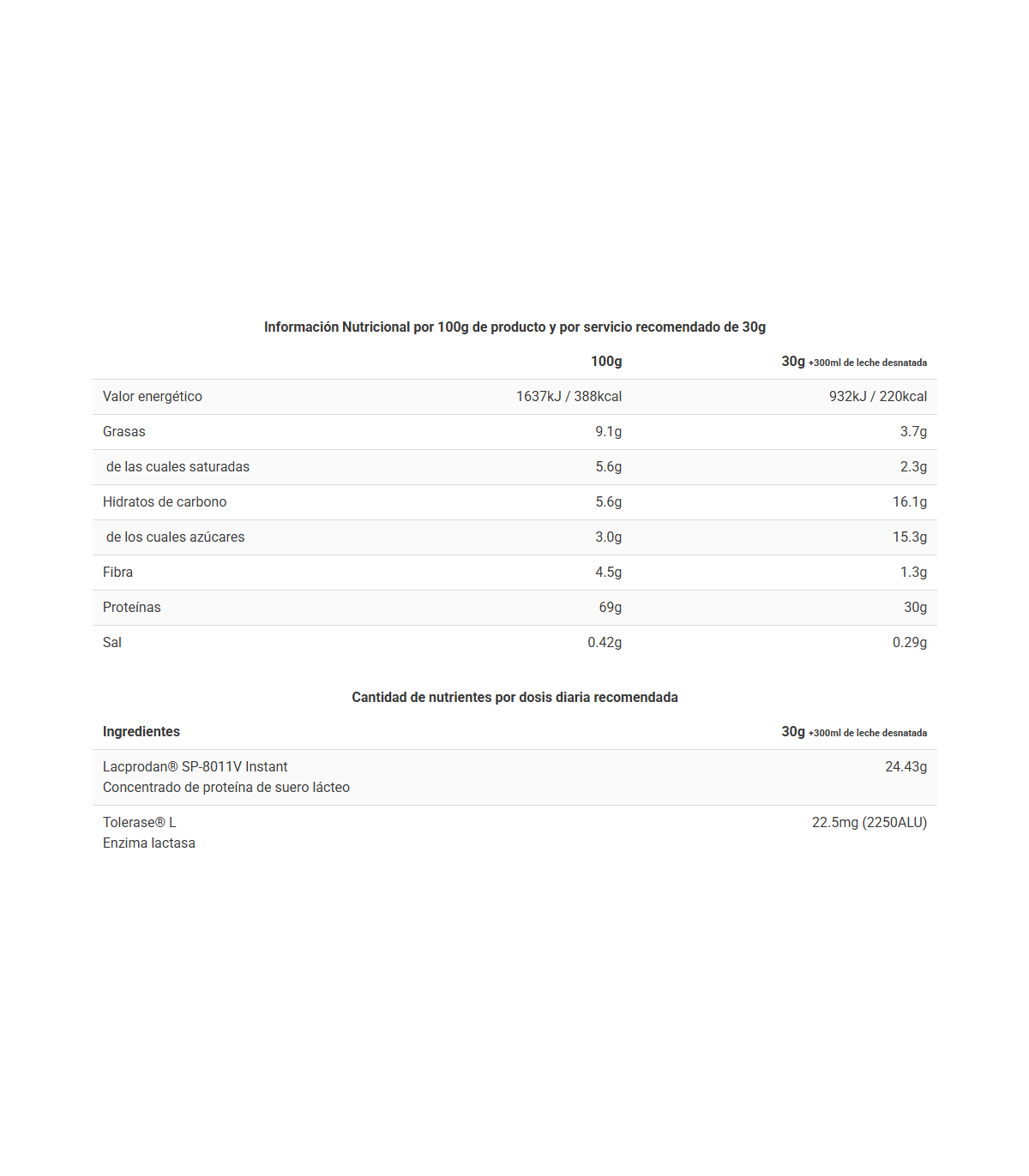 Como suplemento dietético, disolver 30g (1 servicio) mezclados en agua o leche desnatada (200-250 ml). Tomar 1-2 servicios al día, preferiblemente 1 batido en el desayuno y 1 batido después del entrenamiento.