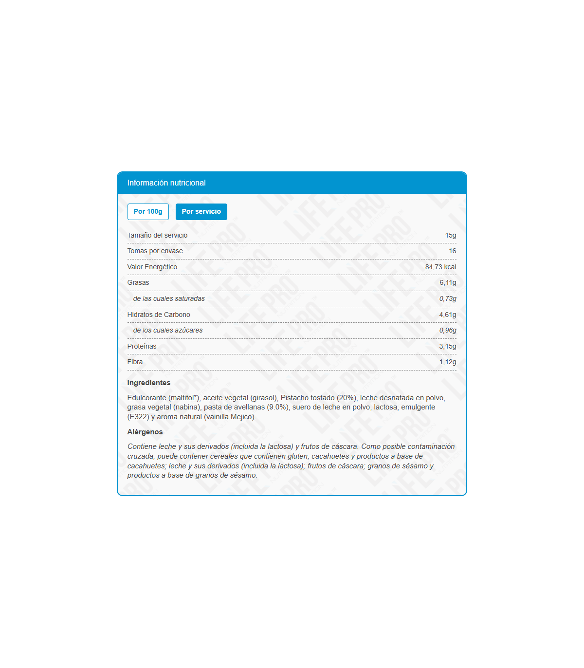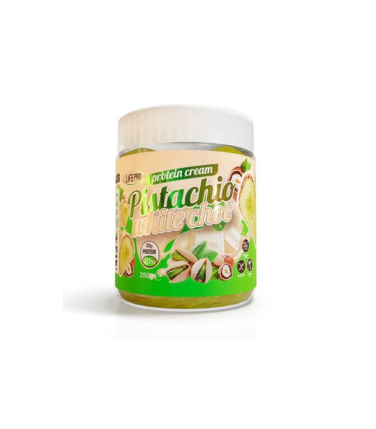 Protein Cream de Life Pro es La mejor crema praliné blanca con pistacho y avellana. La mezcla perfecta con un 20% de proteína aislada, sin azúcares añadidos ni conservantes artificiales.