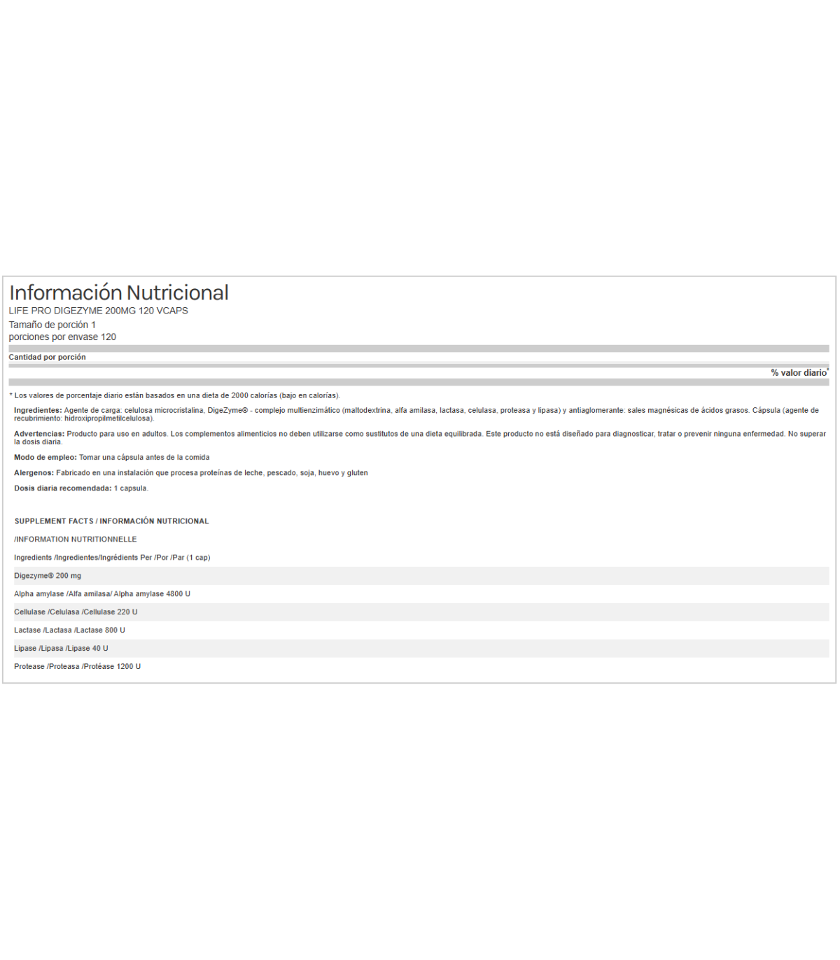 Life Pro Digezyme es una mezcla patentada de enzimas digestivas que tienen como principal objetivo mejorar los procesos de digestiones ya que intervienen en la descomposición de grasas, proteínas y carbohidratos.