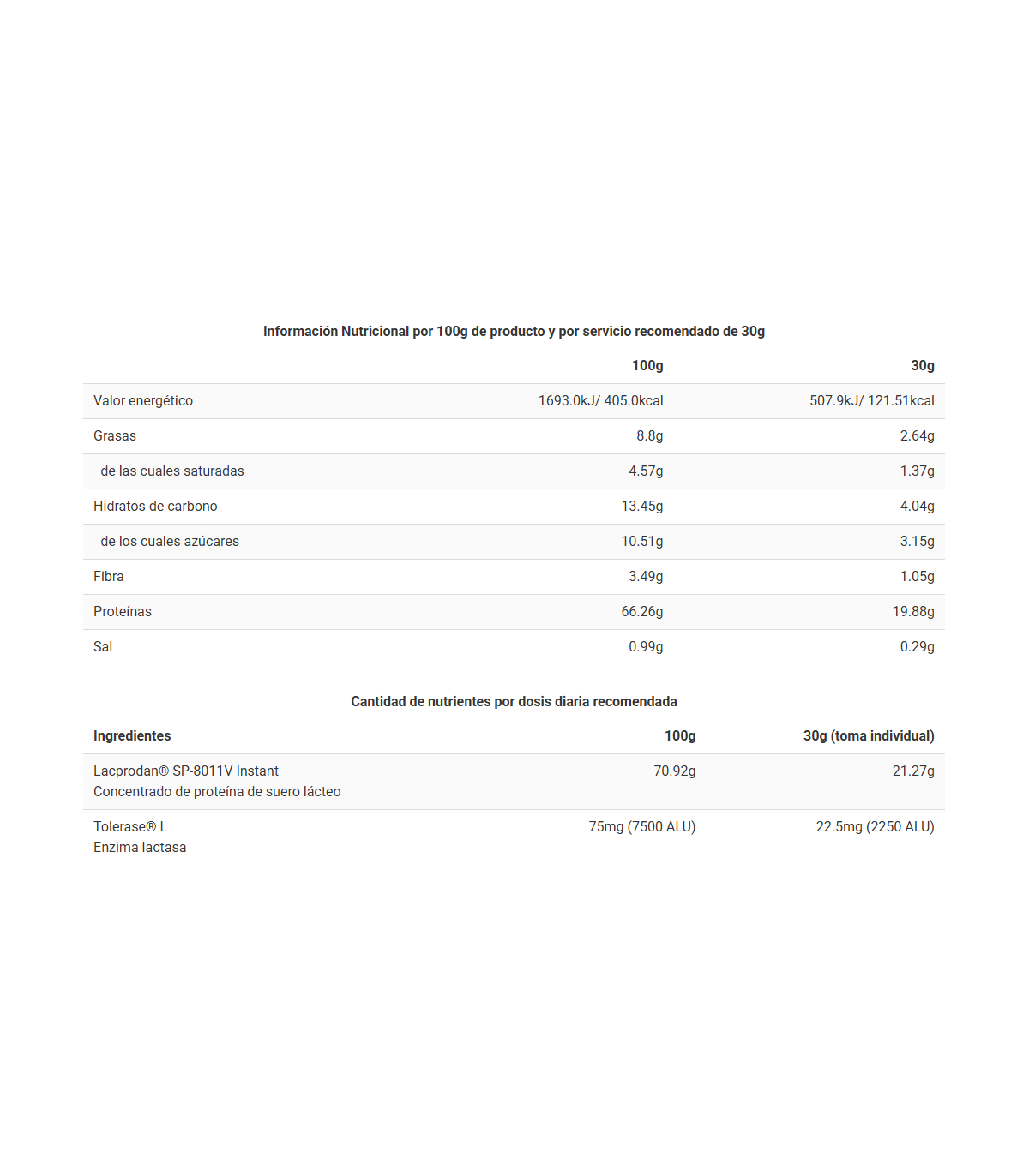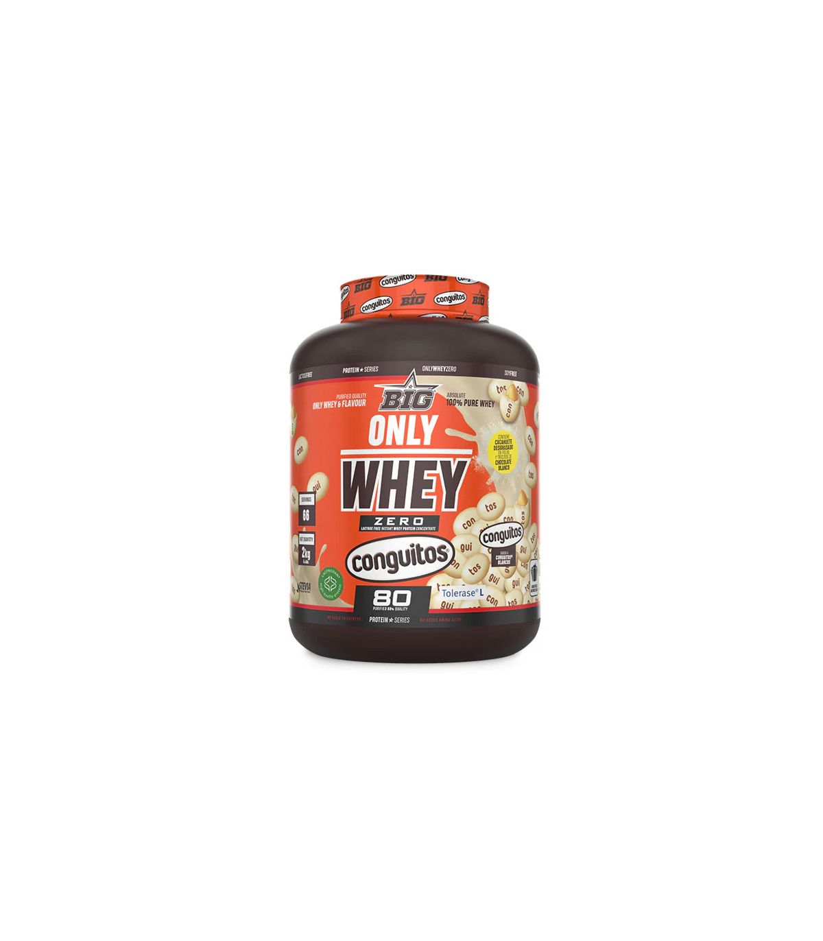 ONLY WHEY ZERO sabor CONGUITOS®, la nueva proteína de concentrado de suero sin lactosa de BIG®, elaborada con Lacprodan® SP-8011V Instant, la proteína elegida por las mejores marcas internacionales de suplementación deportiva y uno de los mejores concentrados de suero del mercado, y con la novedosa patente Tolerase L-Lactasa®, una formulación con enzimas de lactasa que mejora significativamente la digestión de la lactosa contenida en el suero. Sin duda, un valor añadido que marca una diferencia para la mayoría de consumidores que busca una proteína en polvo de la más alta calidad.