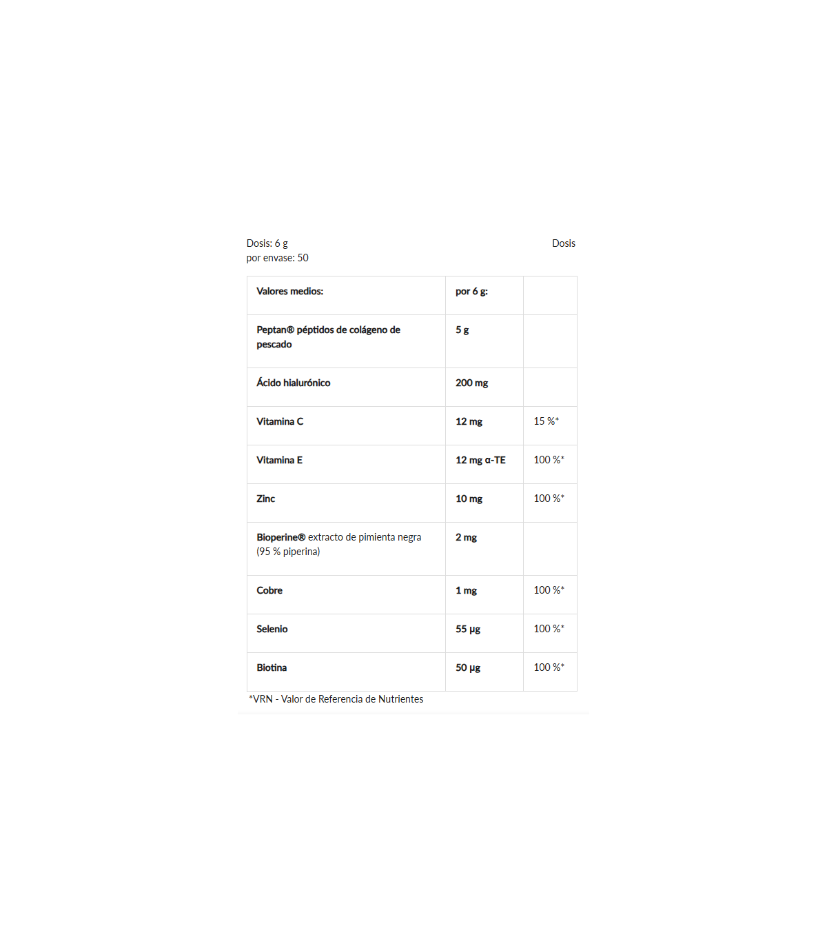 - Aporte de colágeno marino: Contiene 5 g de péptidos de colágeno por dosis, una fuente conocida de proteínas.