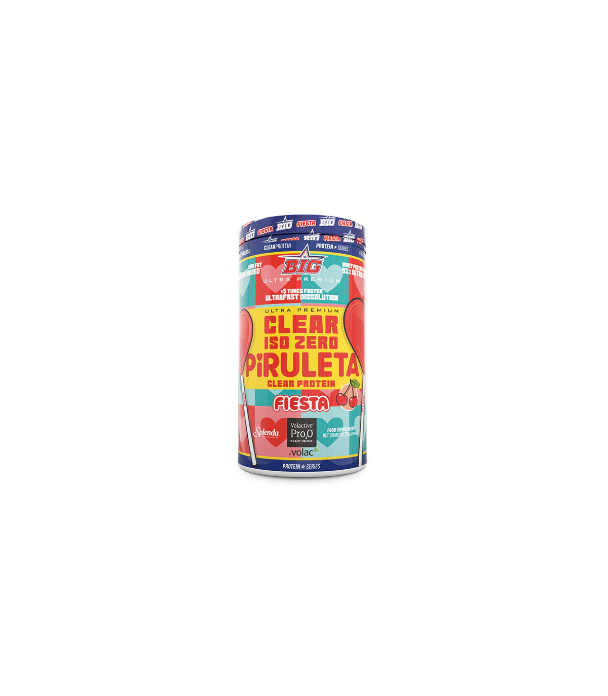 CLEAR ISO ZERO PIRULETA FIESTA® de BIG®, elaborada con la prestigiosa patente Volactive® Pro2O® Ready to Mix de Volac® y con un nuevo sabor desarrollado en colaboración con Fiesta®. La nueva proteína CLEAR ISO ZERO PIRULETA FIESTA® de BIG® contiene un 94% de materia prima bruta, manteniendo una pureza muy por encima de la de sus competidores, con hasta un 66% menos de las sustancias antiespumantes presentes en la mayoría de las proteínas claras.