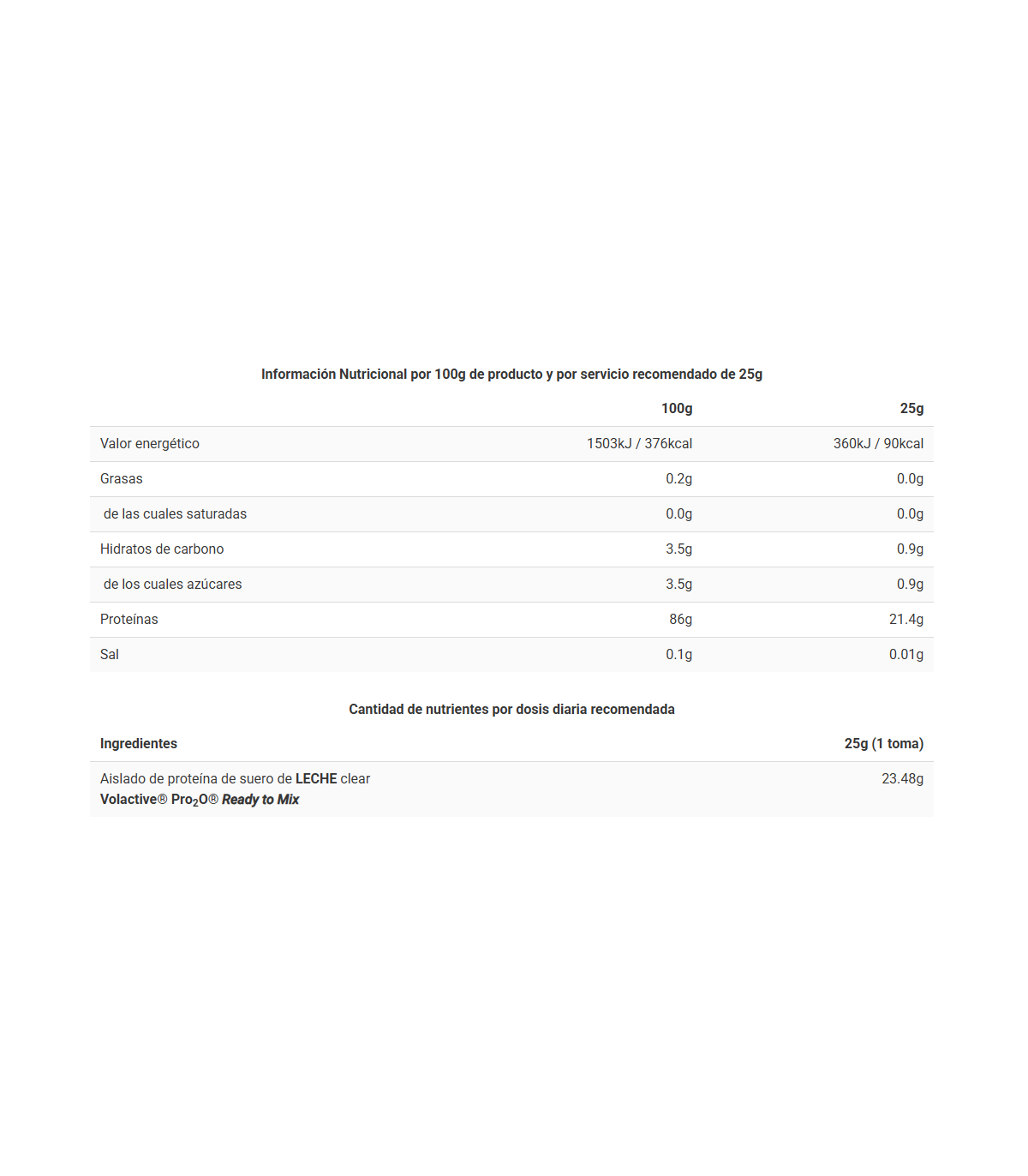 Volactive® Pro2O® Ready to Mix es un aislado de proteína de suero intacto de alta gama y bajo pH. La expresión Ready to Mix hace referencia a sus especiales características de mezcla para batidos claros, que minimiza los principales problemas de las clear protein, como el exceso de espuma o el posible regusto amargo tras su ingesta.
