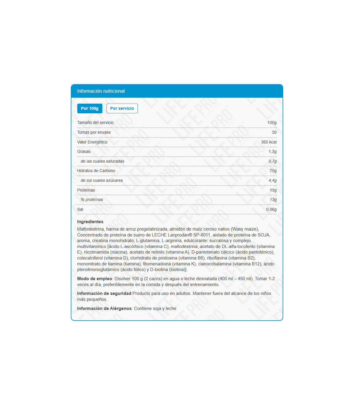 El Mass Gainer Dragon Ball Super Edición Limitada de LifePRO es un complemento alimenticio hipercalórico en polvo diseñado para ayudarte a alcanzar un superávit calórico de forma sencilla, con una combinación estratégica de carbohidratos, proteínas, aminoácidos y vitaminas.