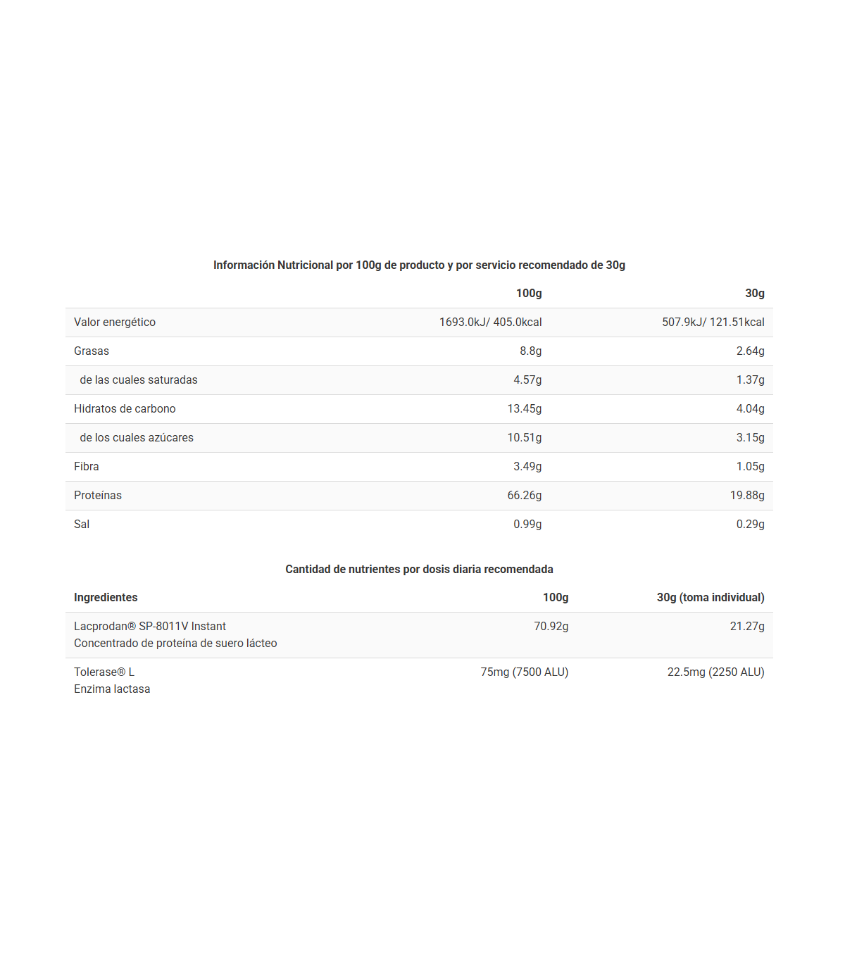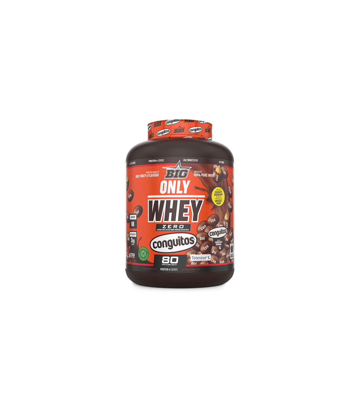 ONLY WHEY ZERO sabor CONGUITOS®, la nueva proteína de concentrado de suero sin lactosa de BIG®, elaborada con Lacprodan® SP-8011V Instant, la proteína elegida por las mejores marcas internacionales de suplementación deportiva y uno de los mejores concentrados de suero del mercado, y con la novedosa patente Tolerase L-Lactasa®, una formulación con enzimas de lactasa que mejora significativamente la digestión de la lactosa contenida en el suero. Sin duda, un valor añadido que marca una diferencia para la mayoría de consumidores que busca una proteína en polvo de la más alta calidad.
