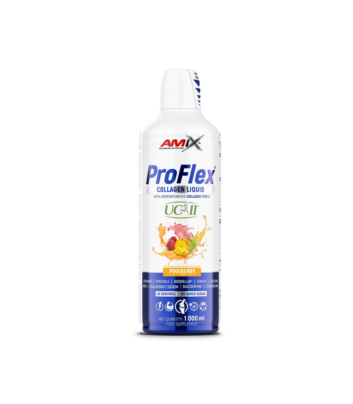 Amix™ ProFlex® Colageno líquido es un concentrado para preparar una bebida deliciosa, rica en vitaminas, minerales, un complejo de hierbas y un complejo de ingredientes activos que contiene hidrolizados de colágeno, especialmente colágeno tipo II no desnaturalizado UC-II®, sulfato de glucosamina, MSM, sulfato de condroitina, hialuronato de sodio y glicina. La vitamina C contribuye al funcionamiento normal del sistema inmunitario y a la formación normal de colágeno para el correcto funcionamiento de huesos, cartílagos y piel. Las vitaminas B2, B6, B12, B6, B12, C, niacina, ácido pantoténico y magnesio contribuyen a reducir el cansancio y la fatiga. El calcio y el magnesio favorecen el funcionamiento normal de músculos y huesos. La boswellia podría ser beneficiosa para la salud ósea y articular.